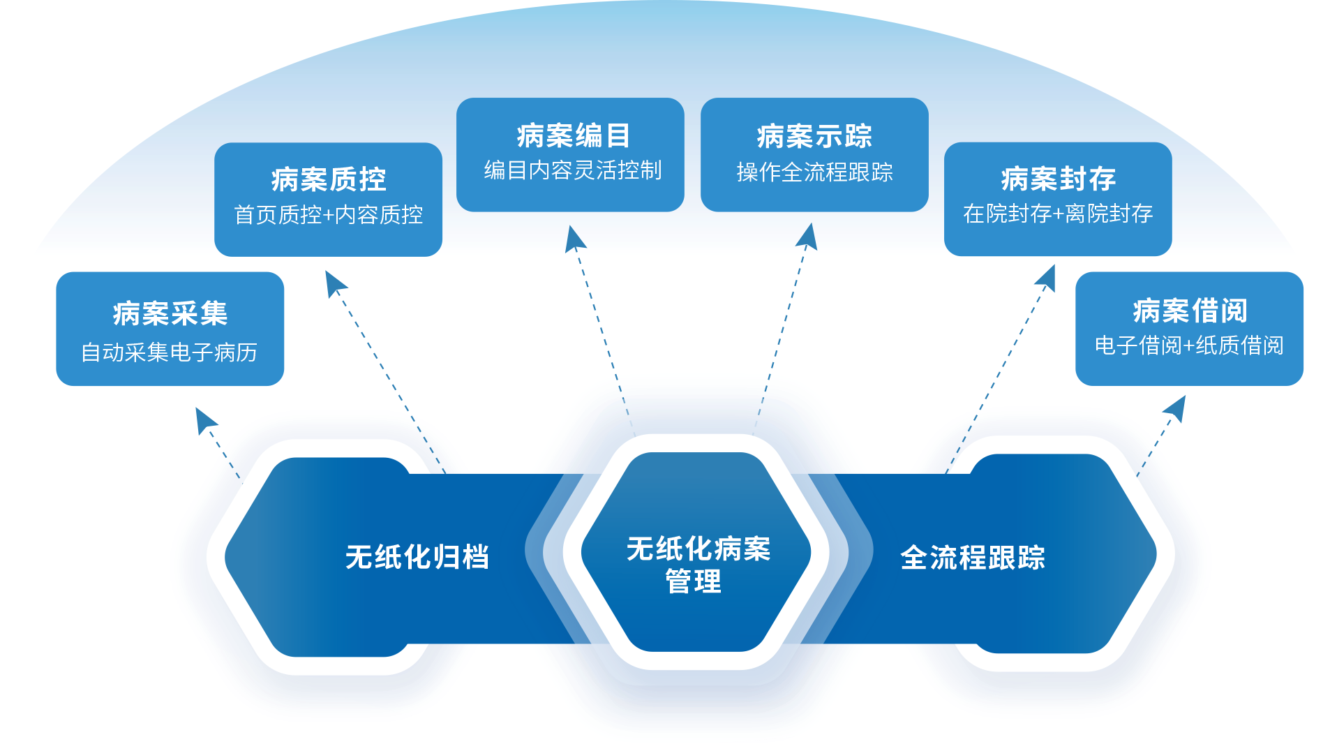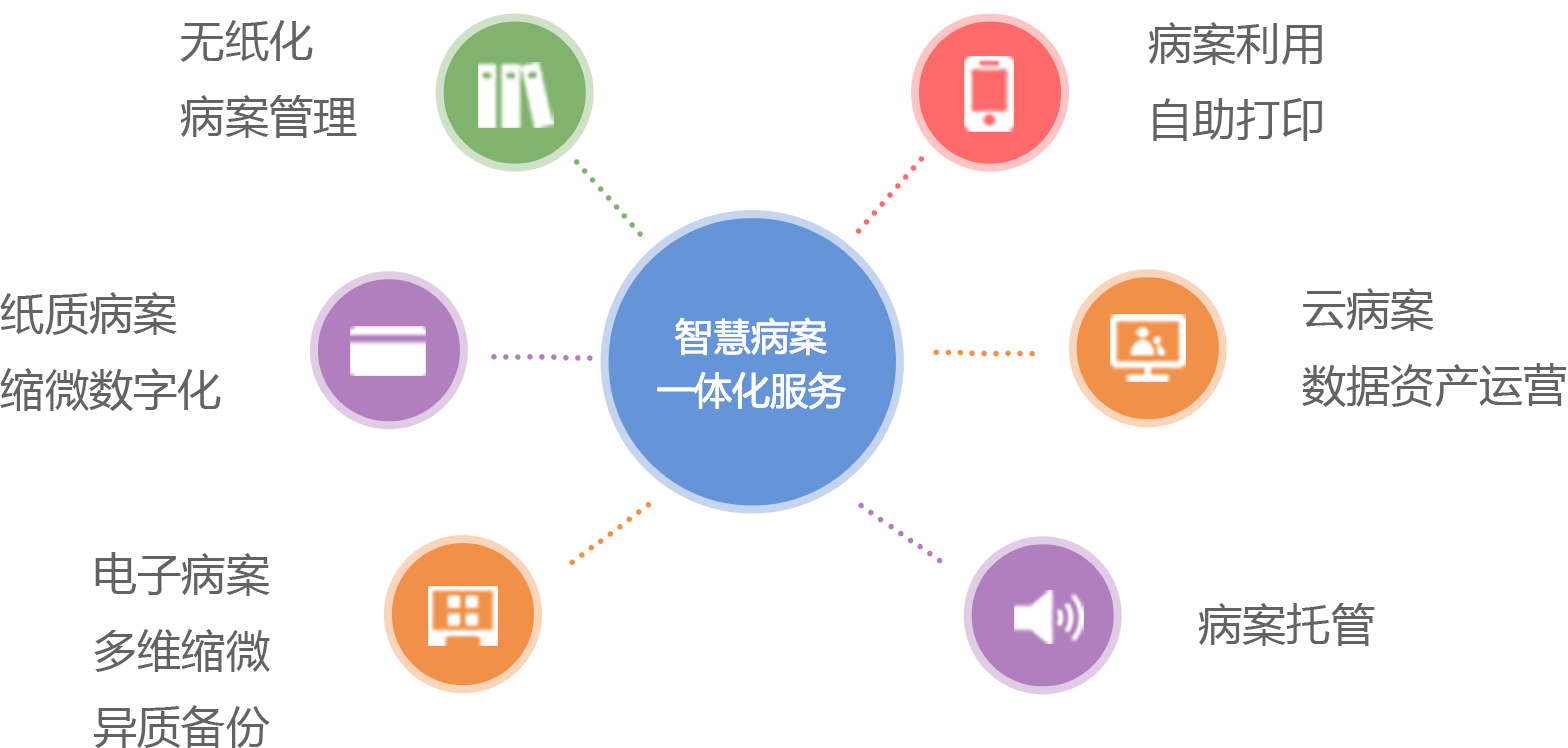 智慧病案服务体系提供包括电子病历无纸化归档管理、缩微异质备份、纸质病历缩微数字化和托管服务、病案智慧化综合利用平台、云病案数据资产化增值运营等在内的全流程、全方位服务。